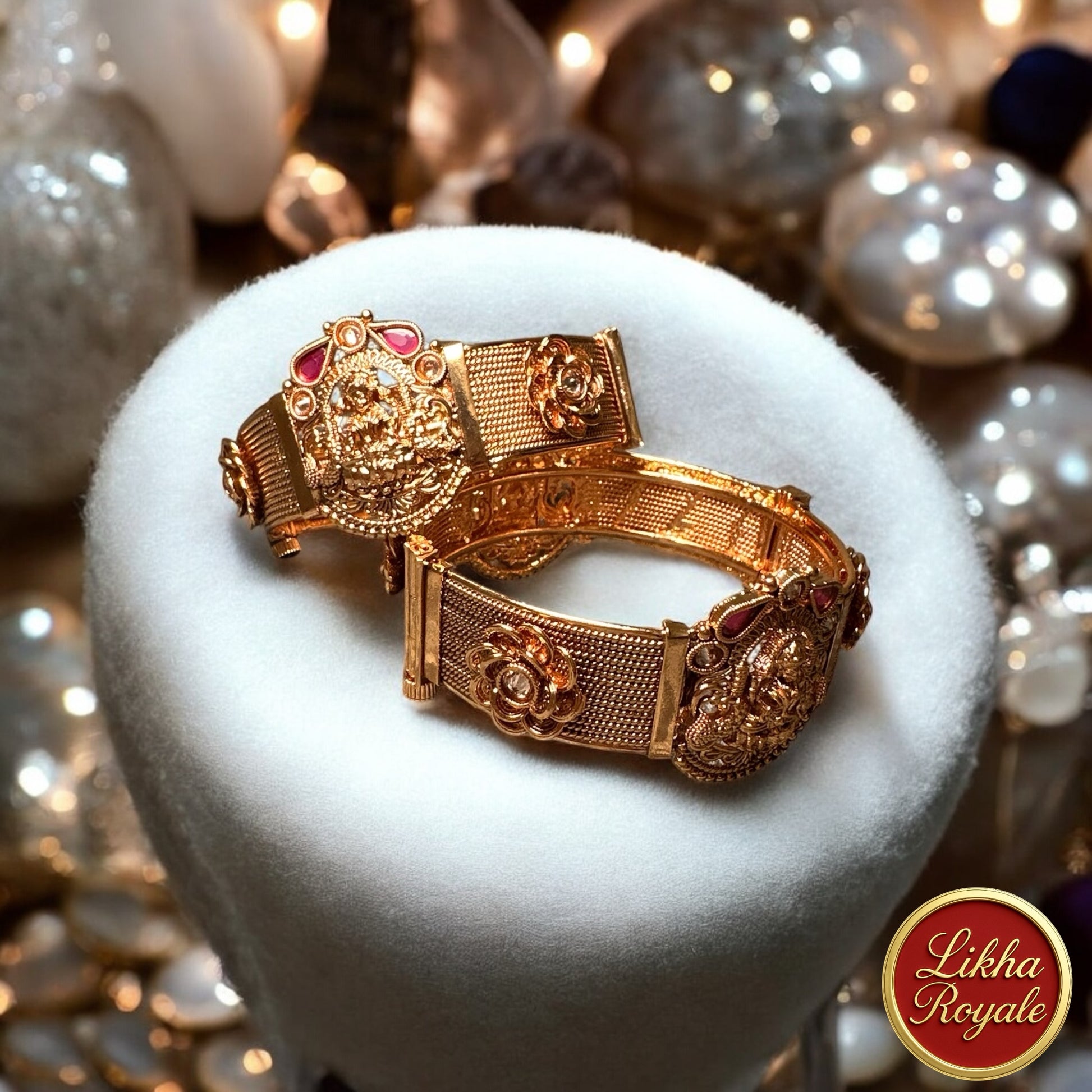 Adorned with the powerful form of Goddess Lakshmi, these intricately crafted gold-plated bangles symbolize prosperity, protection, and grace. A sacred heirloom of spiritual elegance - designed to honor the divine in every woman