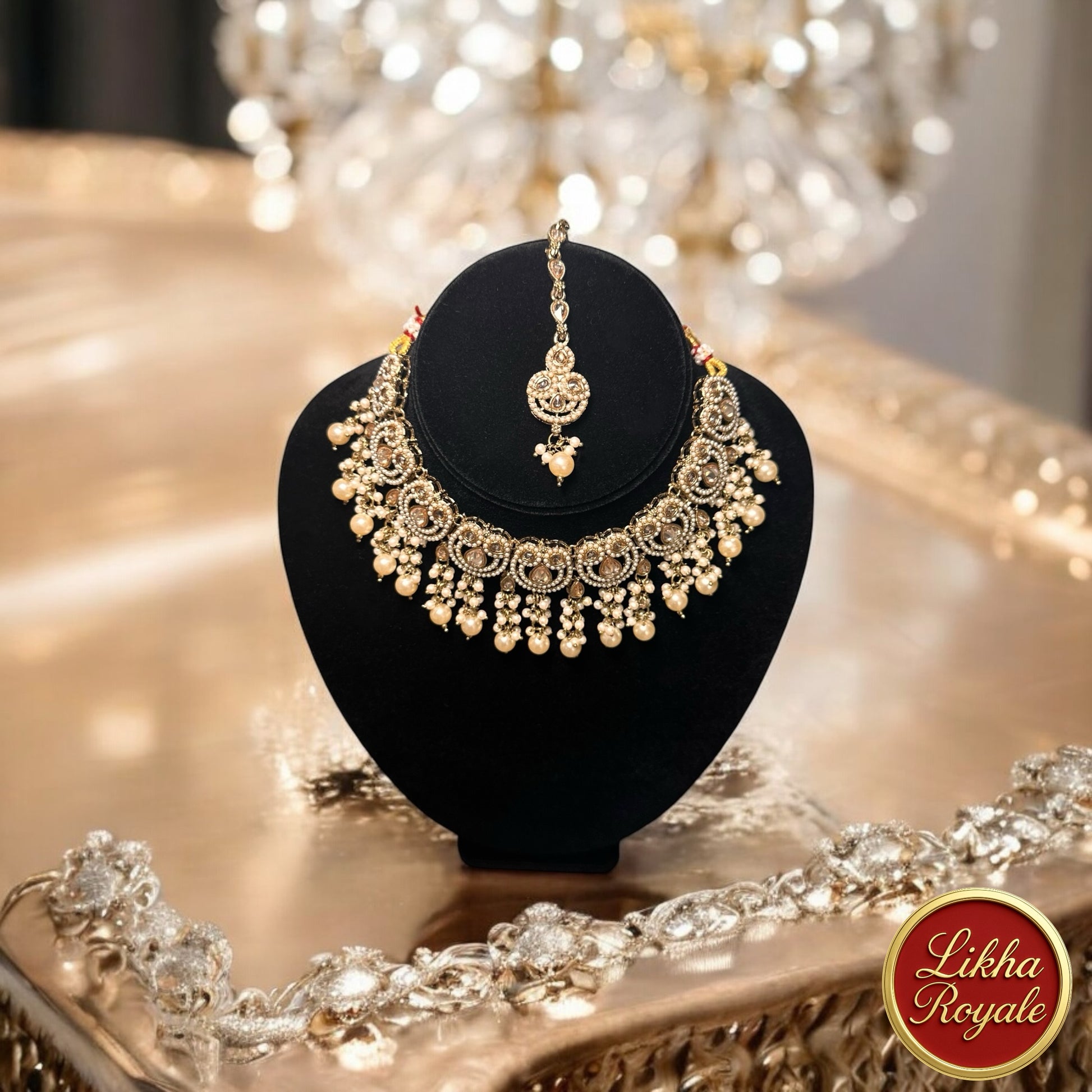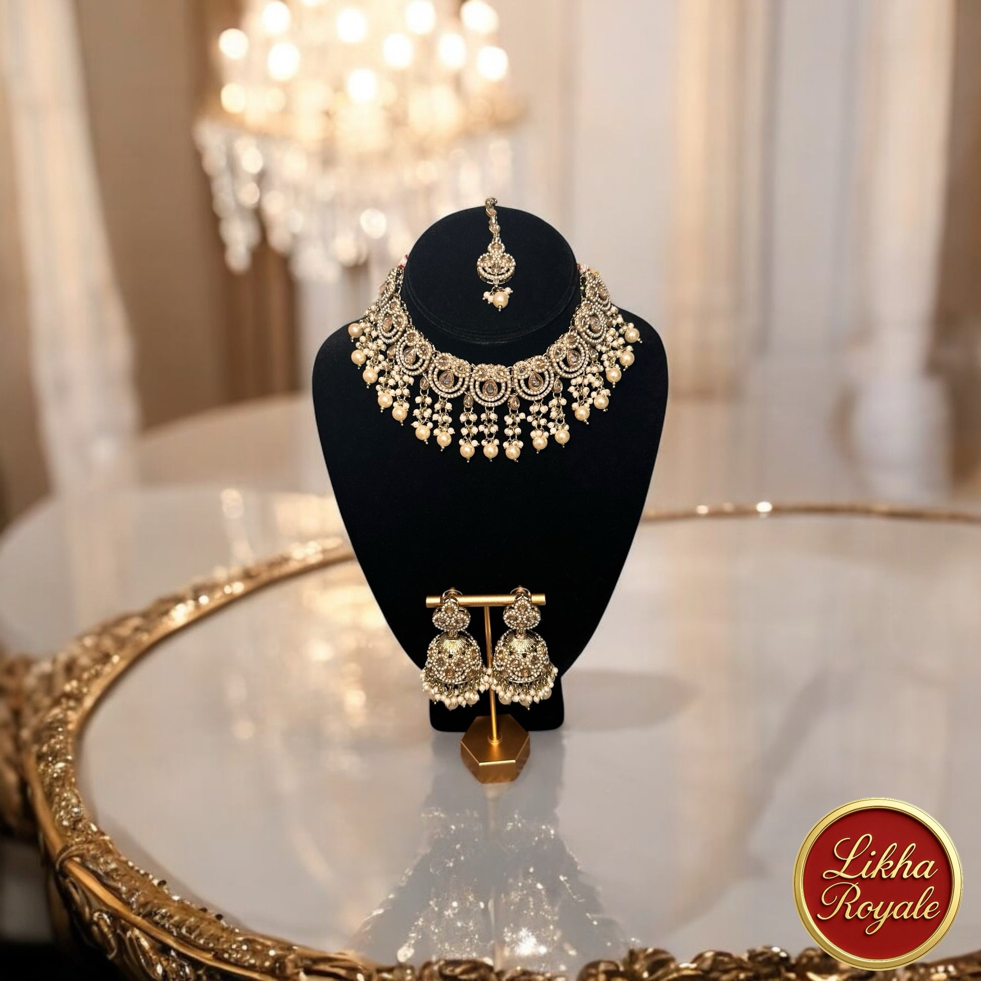 A masterpiece of grandeur, this captivating set weaves tales of royalty through every intricate detail. With its cascading pearls and ornate artistry, it transforms any occasion into a timeless celebration of elegance and power.